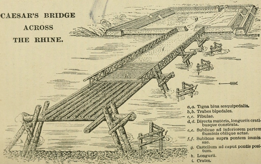 In the aftermath of this victory, the Ubii tribe invited Caesar to cross the Rhine and display his dominance and the Roman standard in Germany, hoping that a show of their siding with Rome would protect them from future harassment from other Germans like the Suebi. So, in ten days, Caesar’s legions built a bridge, forty feet wide, along the River Rhine—a strong and wide river impassable by foot. The feat, a marvel of Roman engineering, was enough to cause many German tribes to offer hostages and friendships in exchange for peace with Caesar. The Suebi called its allies to abandon their homes and form up a war force in a distant forest out of fear of the Romans. Caesar sacked and burned the territory of the Sugambri—a tribe in cahoots with the recently defeated Tencteri and Usipetes—(modern: northern Rhineland, Germany) who had fled in fear at his coming.